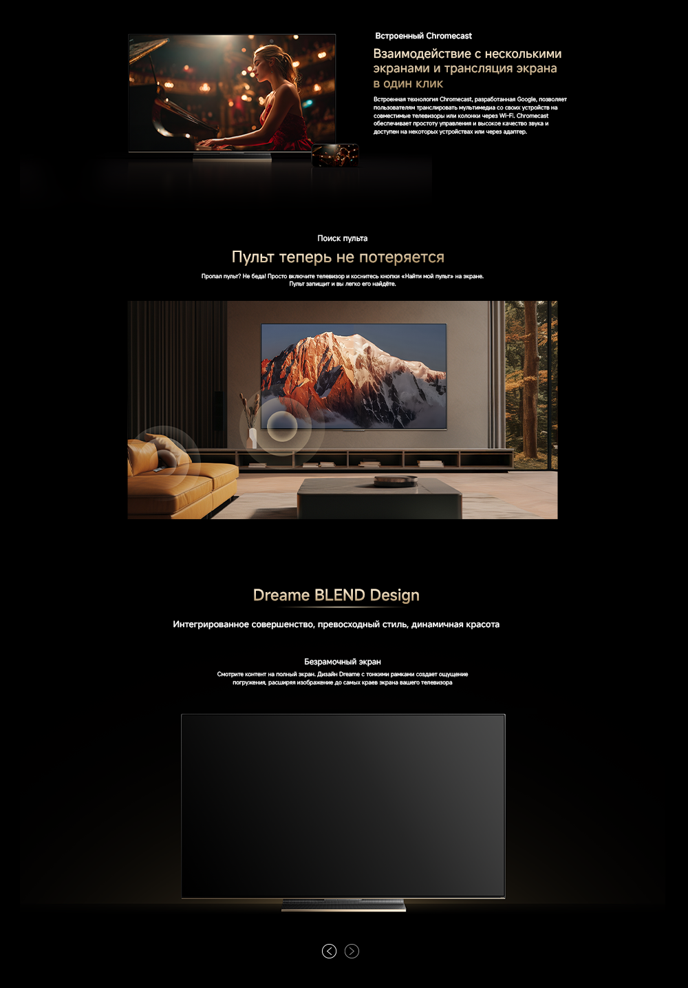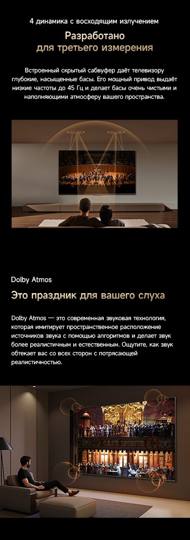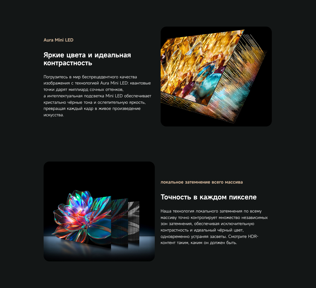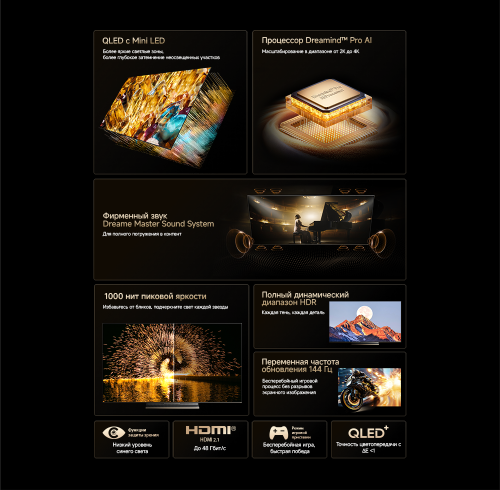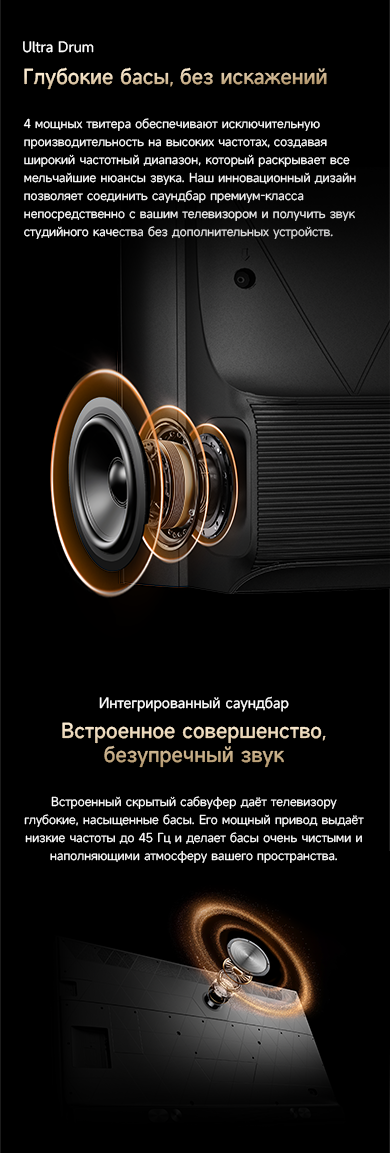 Оснащенный передовой технологией Aura Mini LED, телевизор Dreame TV S100 переосмысливает домашние развлечения, предлагая невероятно насыщенные цвета и глубокий, захватывающий контраст. Но впечатления не ограничиваются экраном - Dreame идет дальше, интегрируя премиальную звуковую панель прямо в телевизор. Никаких дополнительных настроек - только безупречное аудио-видео в одном устройстве.