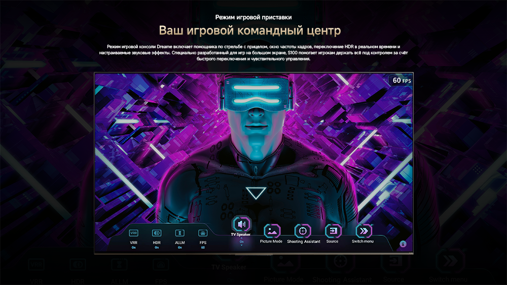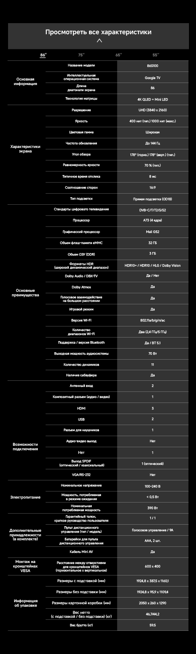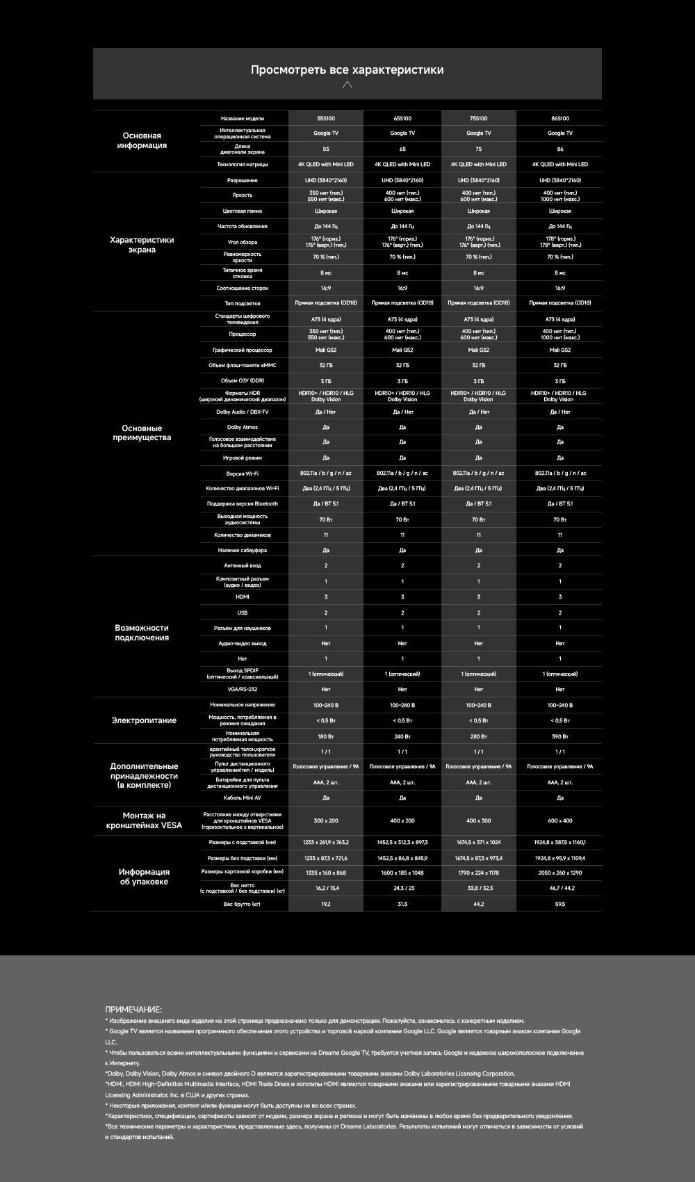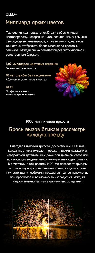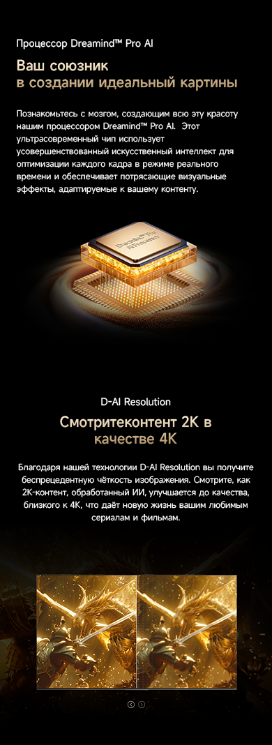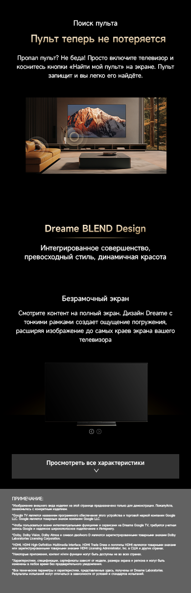 Артикул55 S100ГалереяЦветчерныйОсобенностиОснащенный передовой технологией Aura Mini LED, телевизор Dreame TV S100 переосмысливает домашние развлечения, предлагая невероятно насыщенные цвета и глубокий, захватывающий контраст. Но впечатления не ограничиваются экраном - Dreame идет дальше, интегрируя премиальную звуковую панель прямо в телевизор. Никаких дополнительных настроек - только безупречное аудио-видео в одном устройстве.МодельS100Краткое наименованиеS100Тип экрана4K QLED Mini LEDЧастота обновления матрицы144 ГцSmart TVДаЯркость экрана350-550 НитОперационная системаGoogle TVРазрешение экрана3840х2160Соотношение сторон16:9Тип подсветкиПрямая (OD18)Dolby AtmosДаHDRHDR10+/HLG/Dolby VisionДинамики11Мощность звука70 ВтWi-Fi802.11acBluetooth5.1HDMI3USB2Потребление180 ВтКрепление VESA300х200СабвуферДаПроцессорA73 (4 ядра)ГрафикаMali G52Память32 ГБОЗУ3 ГБУгол обзора176°Время отклика8 мсРавномерность яркости70%Вес16.2 кгИзготовительDreame Trading (Tianjin) Co. Ltd., Китай, Room 2112-1-1, South District, Finance and Trade Center, No.6975 Yazhou Road, Dongjiang Bonded Port Area, Tianjin Pilot Free Trade Zone, TianjinИмпортерООО "АйТи Дистрибуция", 223053, Республика Беларусь, Минская область, Минский район, Боровлянский с/с, 103/3-7, помещение №7-50Гарантийный срок12 месяцев