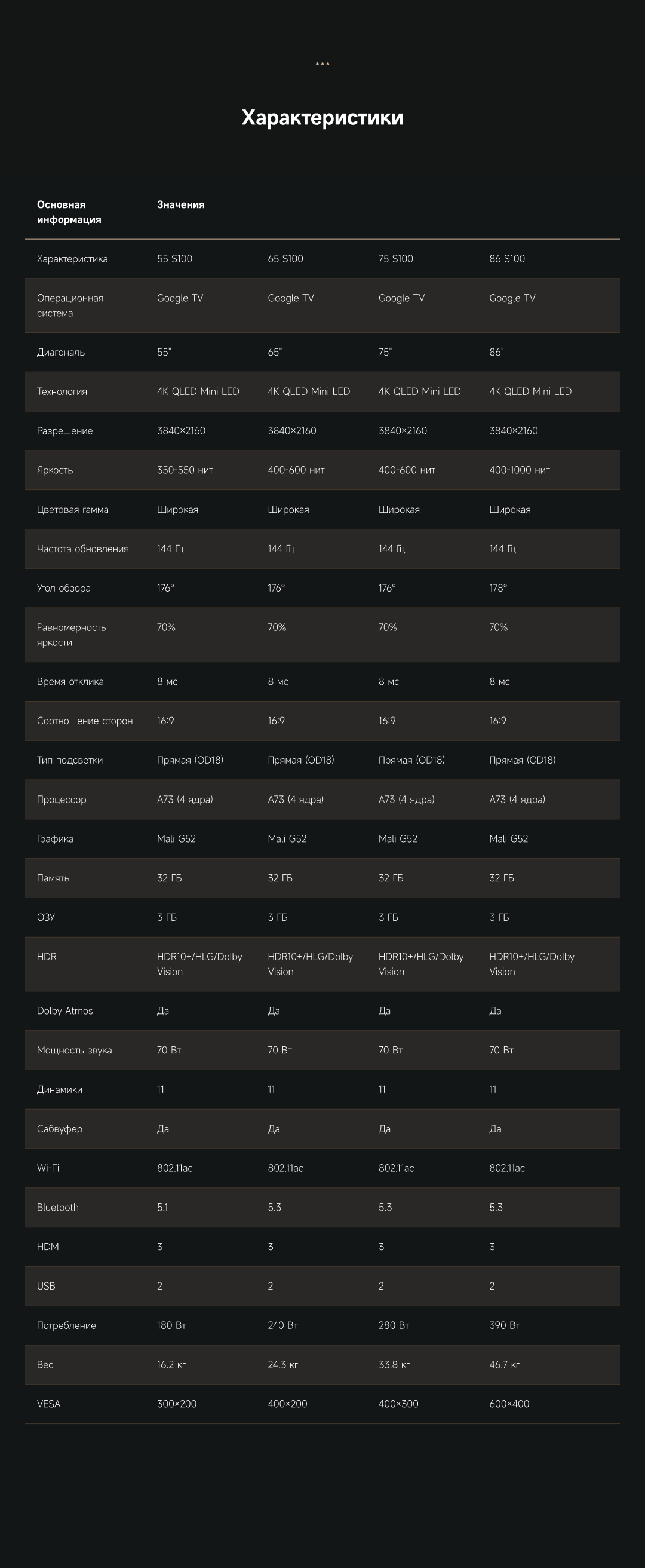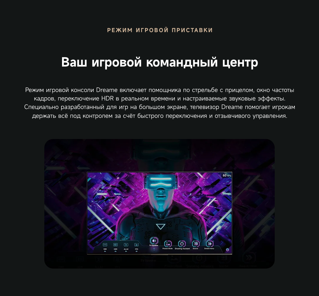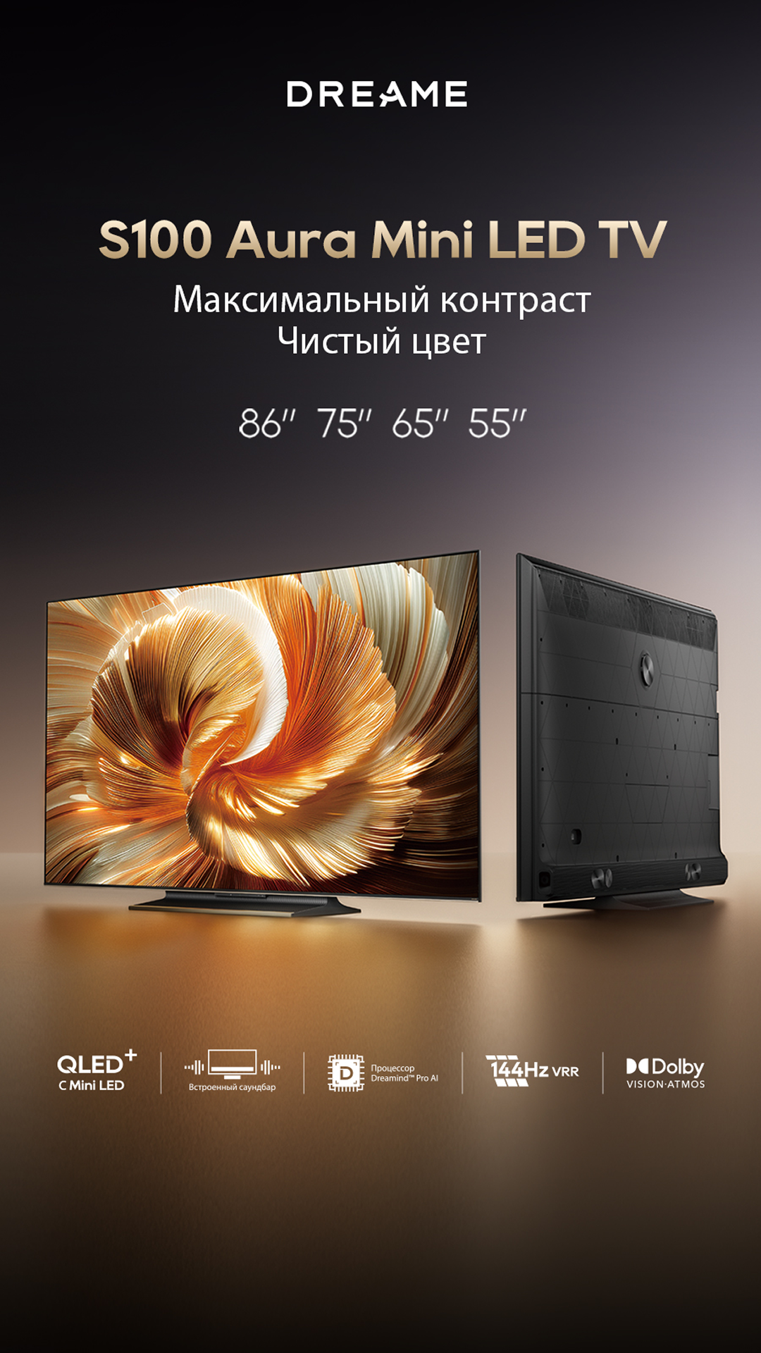 Артикул55 S100ЦветчерныйОсобенностиОснащенный передовой технологией Aura Mini LED, телевизор Dreame TV S100 переосмысливает домашние развлечения, предлагая невероятно насыщенные цвета и глубокий, захватывающий контраст. Но впечатления не ограничиваются экраном - Dreame идет дальше, интегрируя премиальную звуковую панель прямо в телевизор. Никаких дополнительных настроек - только безупречное аудио-видео в одном устройстве.МодельS100Краткое наименованиеS100Тип экрана4K QLED Mini LEDЧастота обновления матрицы144 ГцSmart TVДаЯркость экрана350-550 НитОперационная системаGoogle TVРазрешение экрана3840х2160Соотношение сторон16:9Тип подсветкиПрямая (OD18)Dolby AtmosДаHDRHDR10+/HLG/Dolby VisionДинамики11Мощность звука70 ВтWi-Fi802.11acBluetooth5.1HDMI3USB2Потребление180 ВтКрепление VESA300х200СабвуферДаПроцессорA73 (4 ядра)ГрафикаMali G52Память32 ГБОЗУ3 ГБУгол обзора176°Время отклика8 мсРавномерность яркости70%Вес16.2 кгИзготовительООО «АйПиДи Групп», Республика Беларусь, 222205, Минская область, Смолевичский р-н, Китайско-Белорусский индустриальный парк «Великий камень» Республика Беларусь, 222205, Минская область, Смолевичский р-н, Китайско-Белорусский индустриальный парк «Великий камень»ПроизводительКомпания «Хуаюнь Технолоджи (Сучжоу) Лимитед» комната 517, корпус 5011, Nº 282, улица Донгпинг, промышленный парк Сучжоу, филиал китайской пилотной зоны свободной торговли (провинция Цзянсу) в СучжоуГарантийный срок12 месяцев