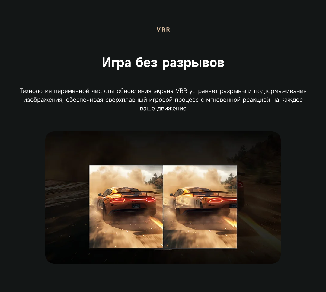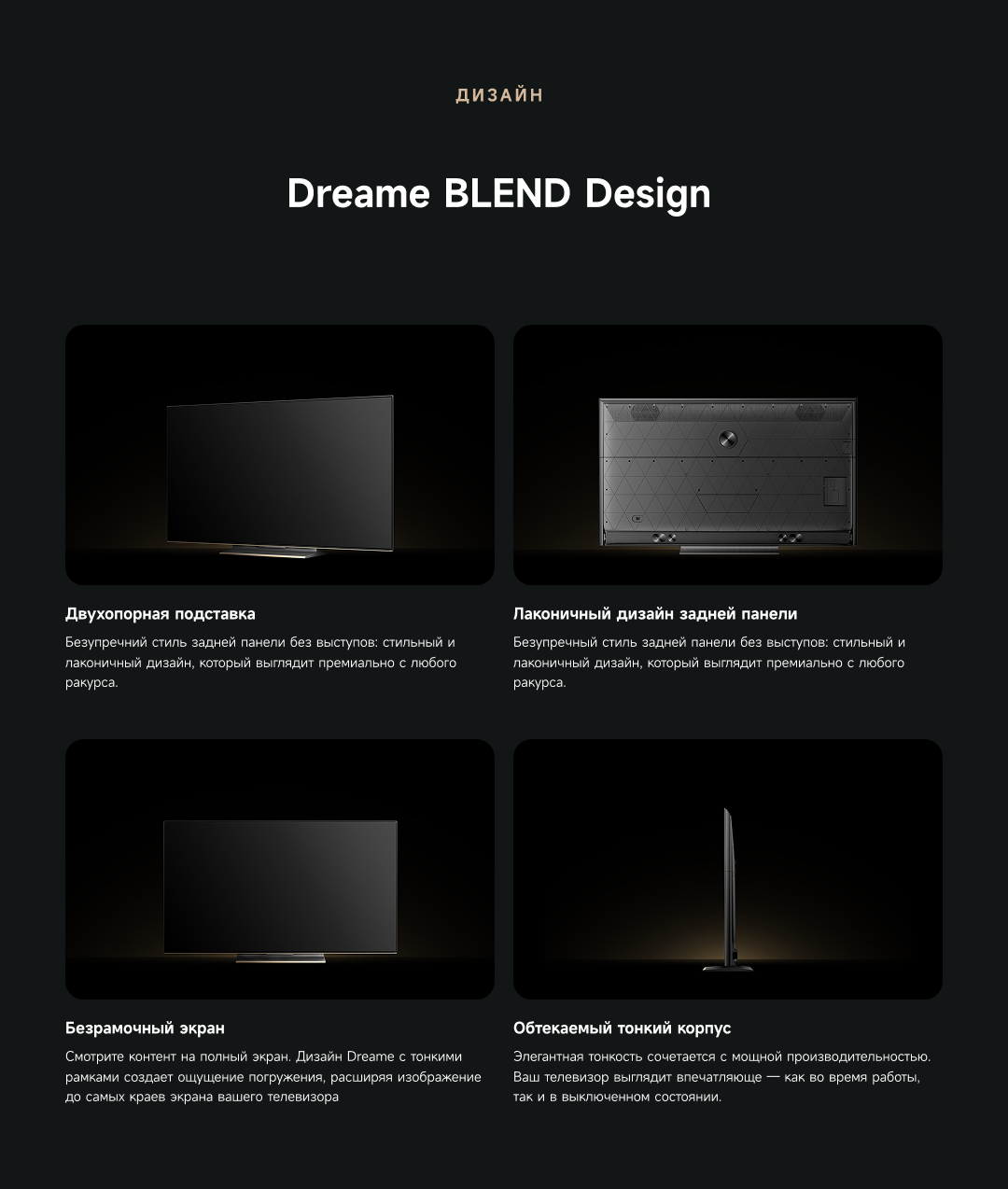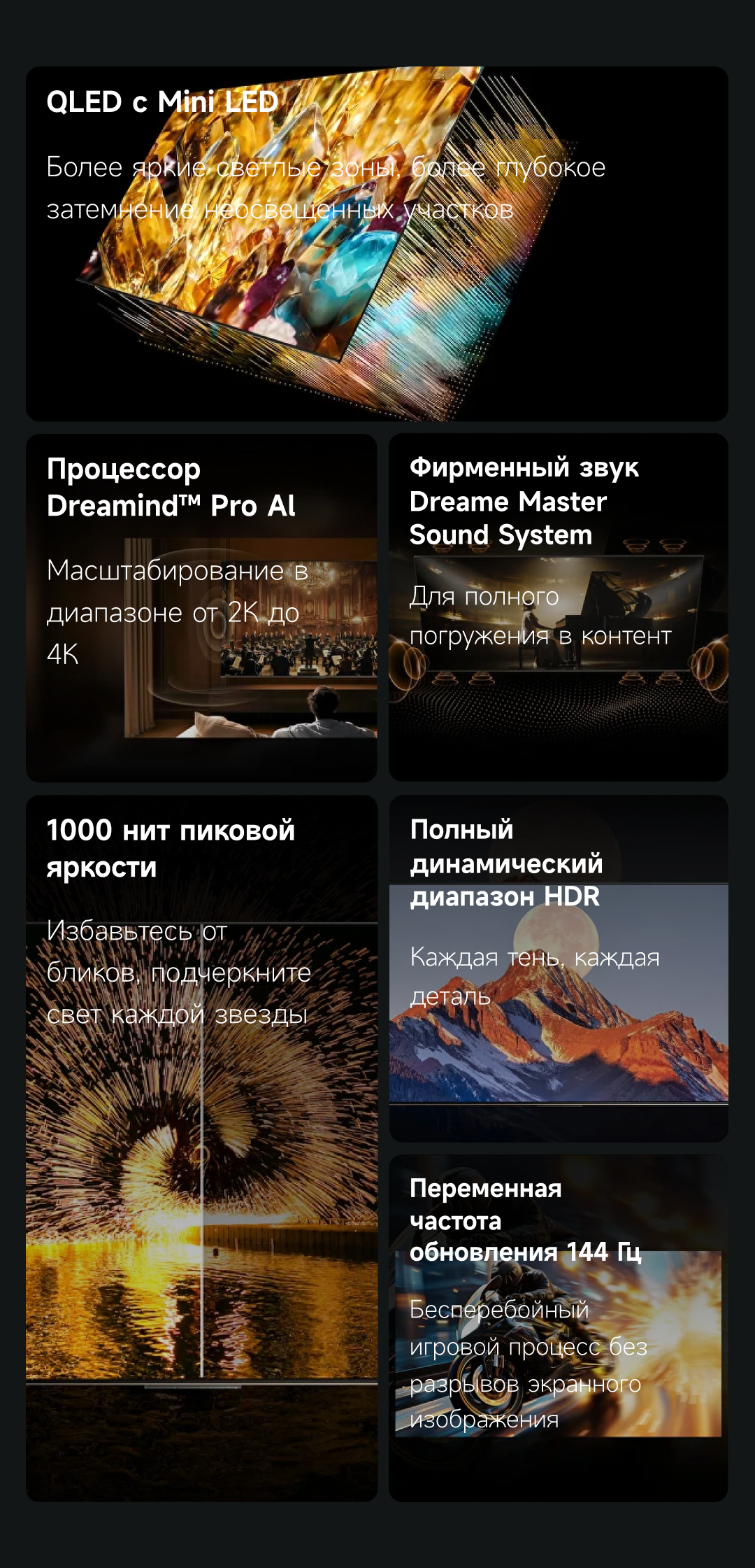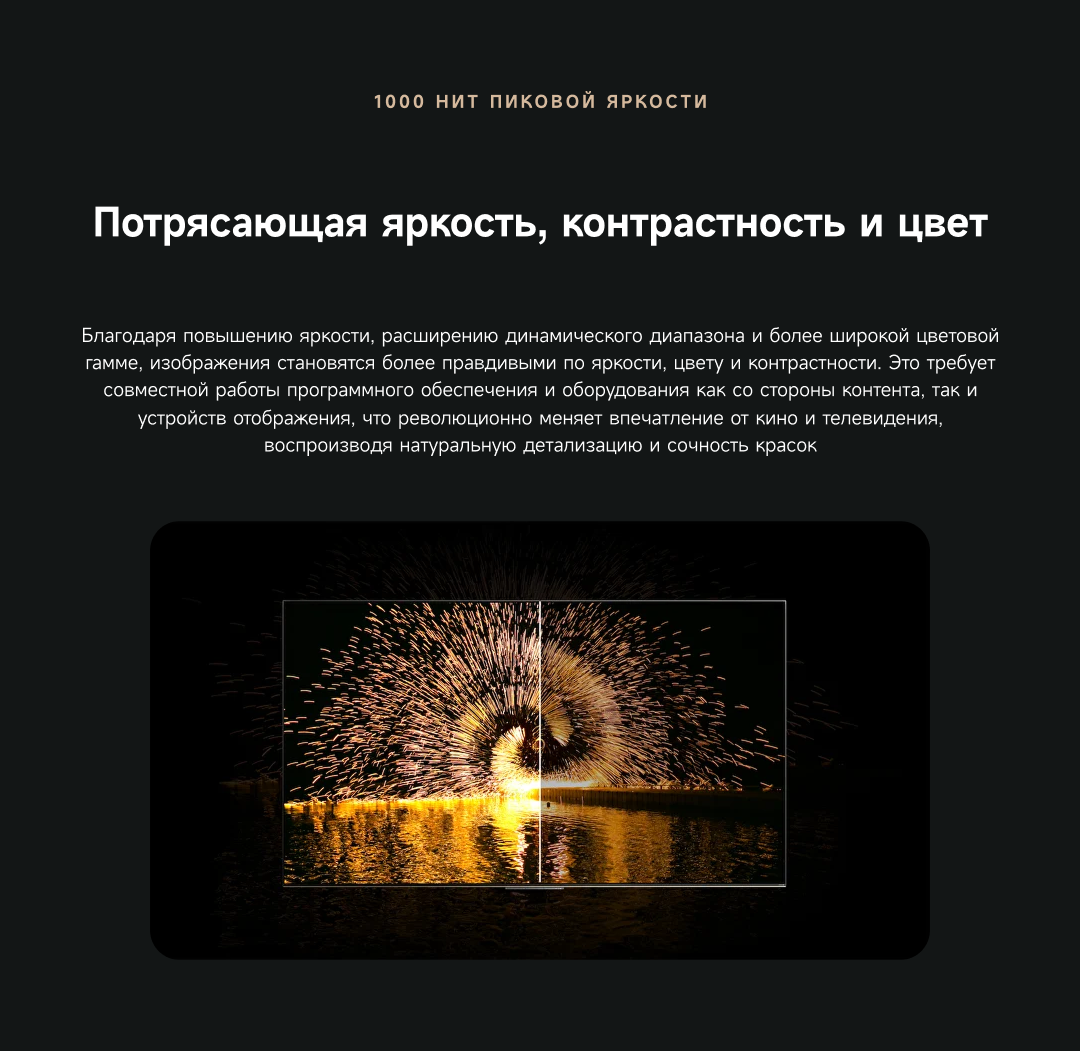 Артикул55 S100ЦветчерныйОсобенностиОснащенный передовой технологией Aura Mini LED, телевизор Dreame TV S100 переосмысливает домашние развлечения, предлагая невероятно насыщенные цвета и глубокий, захватывающий контраст. Но впечатления не ограничиваются экраном - Dreame идет дальше, интегрируя премиальную звуковую панель прямо в телевизор. Никаких дополнительных настроек - только безупречное аудио-видео в одном устройстве.МодельS100Краткое наименованиеS100Тип экрана4K QLED Mini LEDЧастота обновления матрицы144 ГцSmart TVДаЯркость экрана350-550 НитОперационная системаGoogle TVРазрешение экрана3840х2160Соотношение сторон16:9Тип подсветкиПрямая (OD18)Dolby AtmosДаHDRHDR10+/HLG/Dolby VisionДинамики11Мощность звука70 ВтWi-Fi802.11acBluetooth5.1HDMI3USB2Потребление180 ВтКрепление VESA300х200СабвуферДаПроцессорA73 (4 ядра)ГрафикаMali G52Память32 ГБОЗУ3 ГБУгол обзора176°Время отклика8 мсРавномерность яркости70%Вес16.2 кгИзготовительООО «АйПиДи Групп», Республика Беларусь, 222205, Минская область, Смолевичский р-н, Китайско-Белорусский индустриальный парк «Великий камень» Республика Беларусь, 222205, Минская область, Смолевичский р-н, Китайско-Белорусский индустриальный парк «Великий камень»ПроизводительКомпания «Хуаюнь Технолоджи (Сучжоу) Лимитед» комната 517, корпус 5011, Nº 282, улица Донгпинг, промышленный парк Сучжоу, филиал китайской пилотной зоны свободной торговли (провинция Цзянсу) в СучжоуГарантийный срок12 месяцев