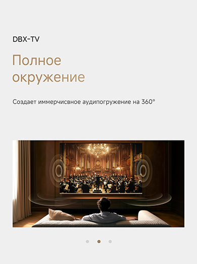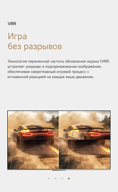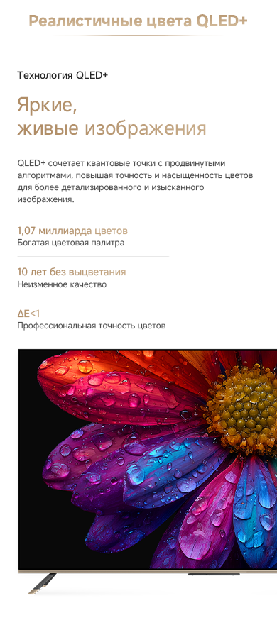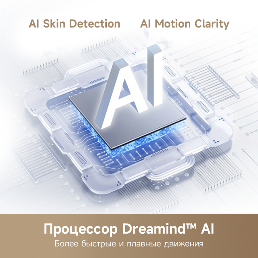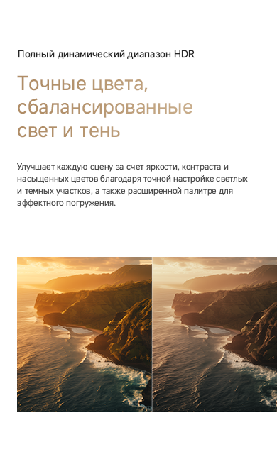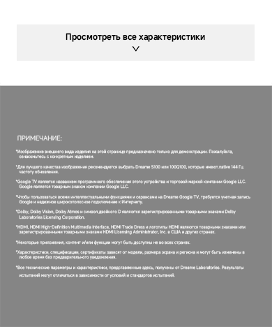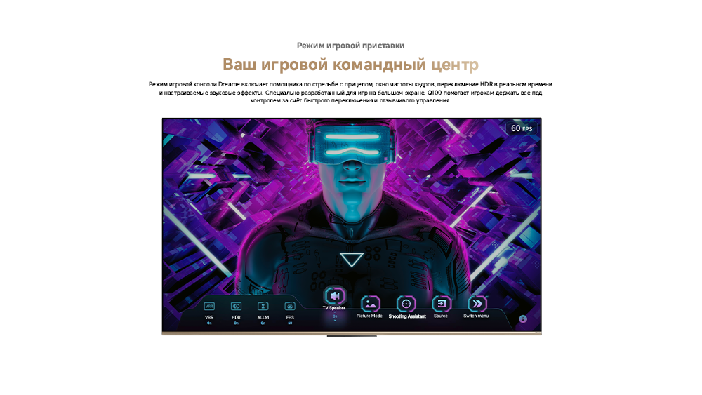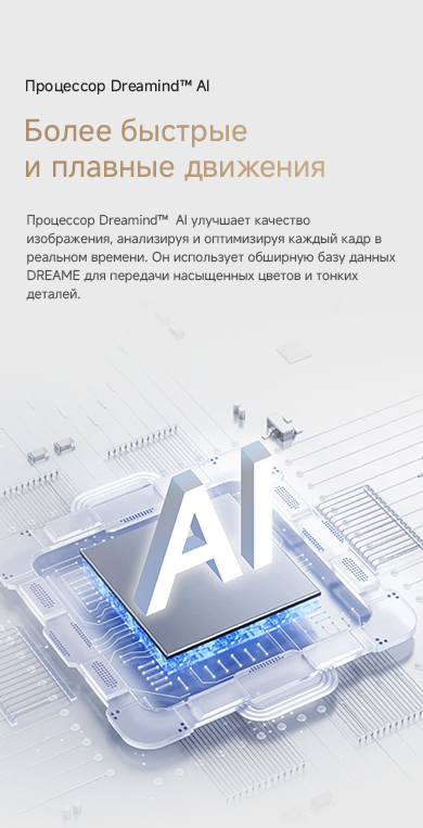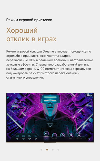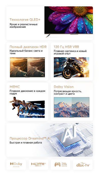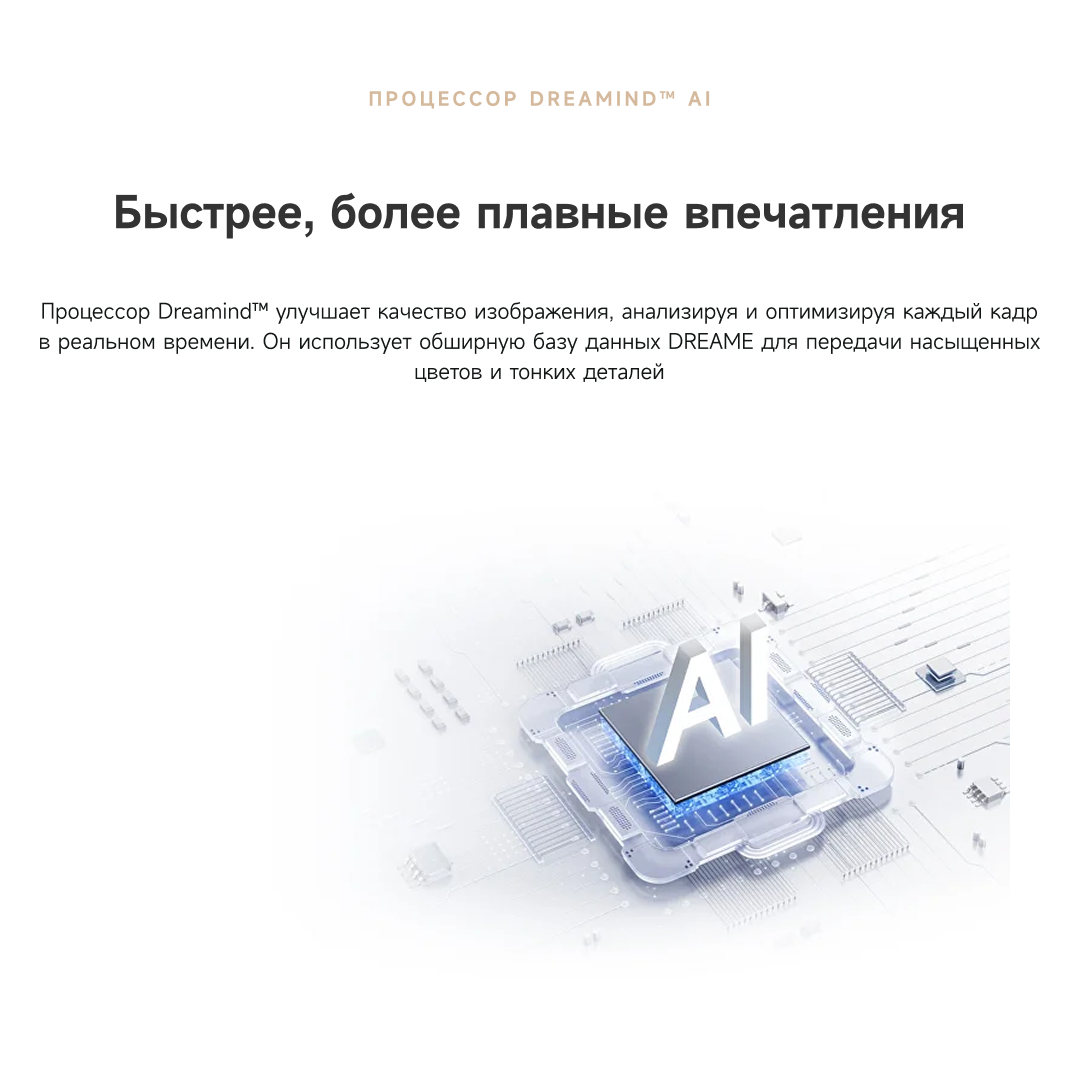 Цветовая палитра 1.07 миллиарда цветов. 10 лет без выцветания. Технология на основе ИИ улучшает быстро движущиеся сцены, устраняя размытие и делая изображение плавным. Высокая частота обновления 120 Гц с технологией True Motion обеспечивает плавное и чёткое изображение. Режим игровой консоли Dreame включает помощника по стрельбе с прицелом, окно частоты кадров, переключение HDR в реальном времени и настраиваемые звуковые эффекты. Опция "Найти пульт".