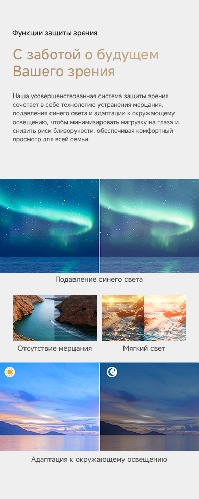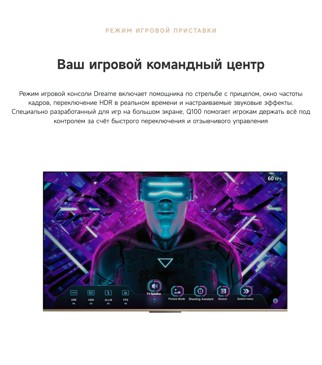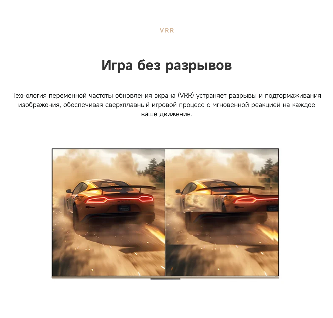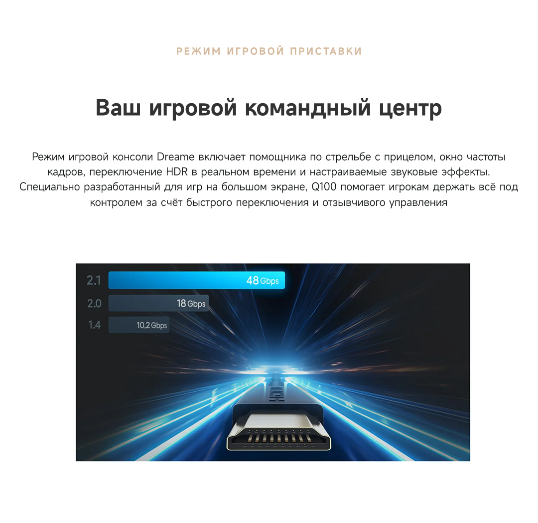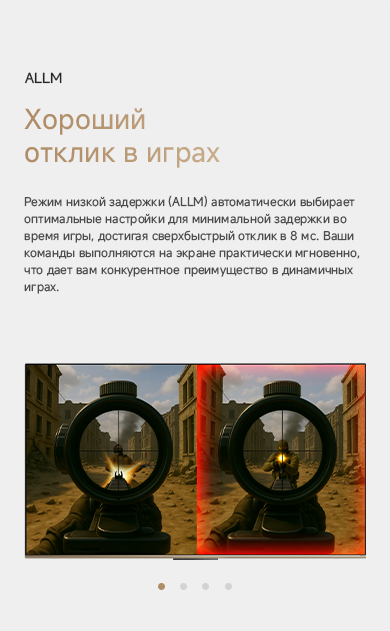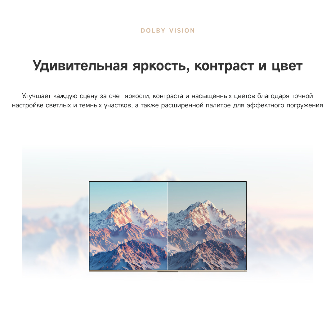 Цветовая палитра 1.07 миллиарда цветов. 10 лет без выцветания. Технология на основе ИИ улучшает быстро движущиеся сцены, устраняя размытие и делая изображение плавным. Высокая частота обновления 120 Гц с технологией True Motion обеспечивает плавное и чёткое изображение. Режим игровой консоли Dreame включает помощника по стрельбе с прицелом, окно частоты кадров, переключение HDR в реальном времени и настраиваемые звуковые эффекты. Опция "Найти пульт".
