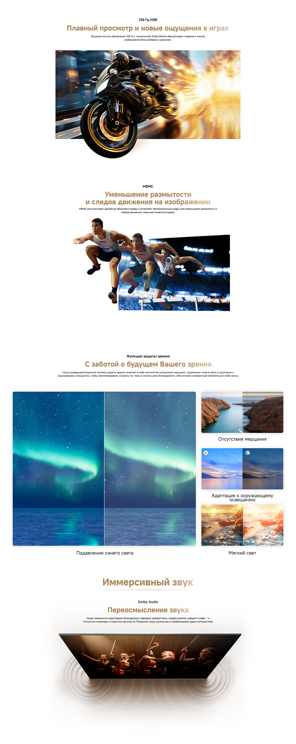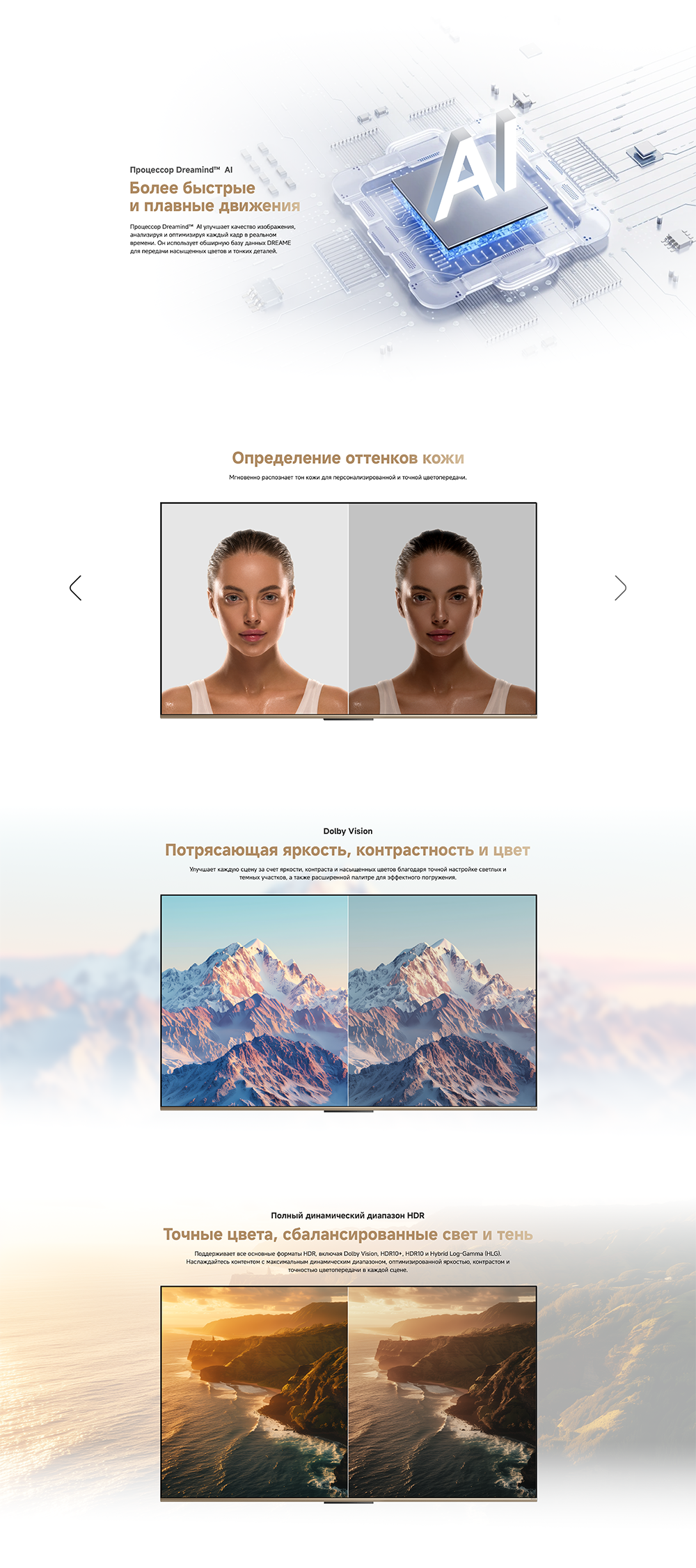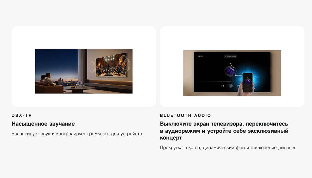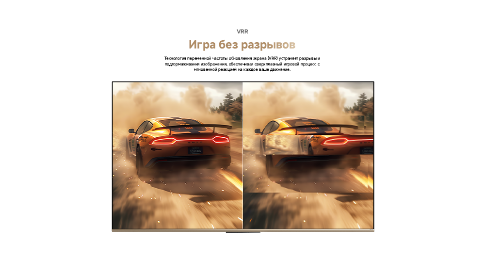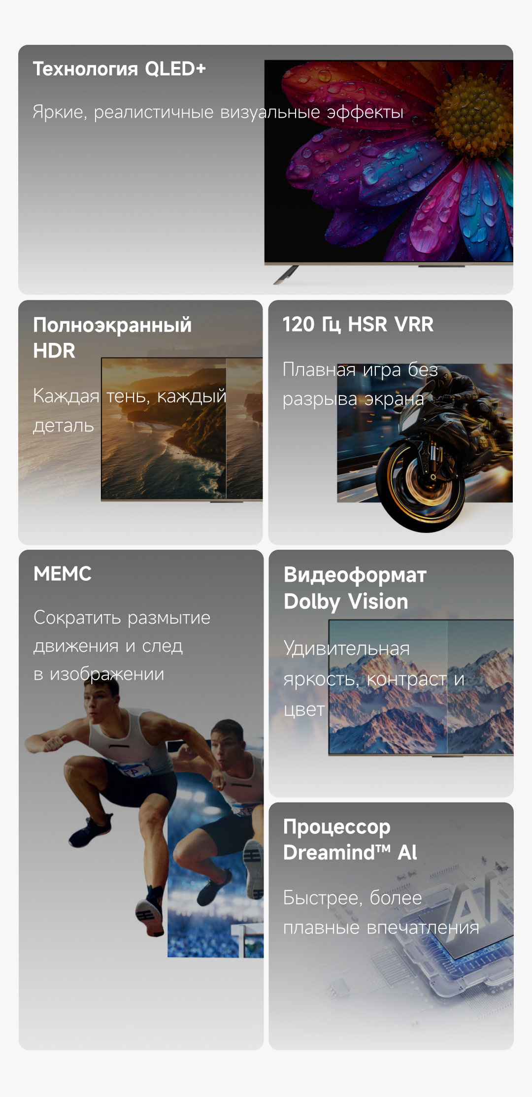 Цветовая палитра 1.07 миллиарда цветов. 10 лет без выцветания. Технология на основе ИИ улучшает быстро движущиеся сцены, устраняя размытие и делая изображение плавным. Высокая частота обновления 120 Гц с технологией True Motion обеспечивает плавное и чёткое изображение. Режим игровой консоли Dreame включает помощника по стрельбе с прицелом, окно частоты кадров, переключение HDR в реальном времени и настраиваемые звуковые эффекты. Опция "Найти пульт".