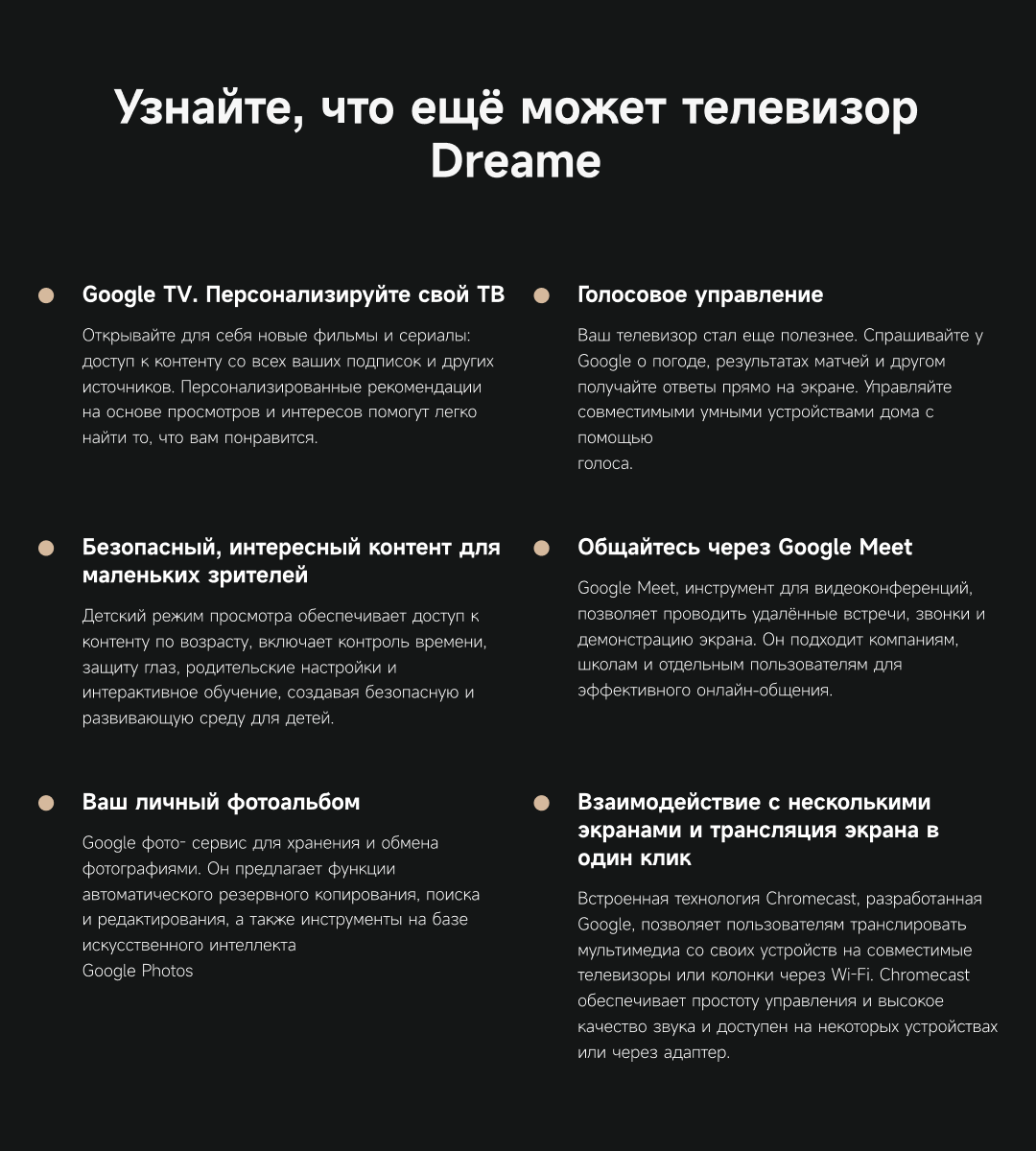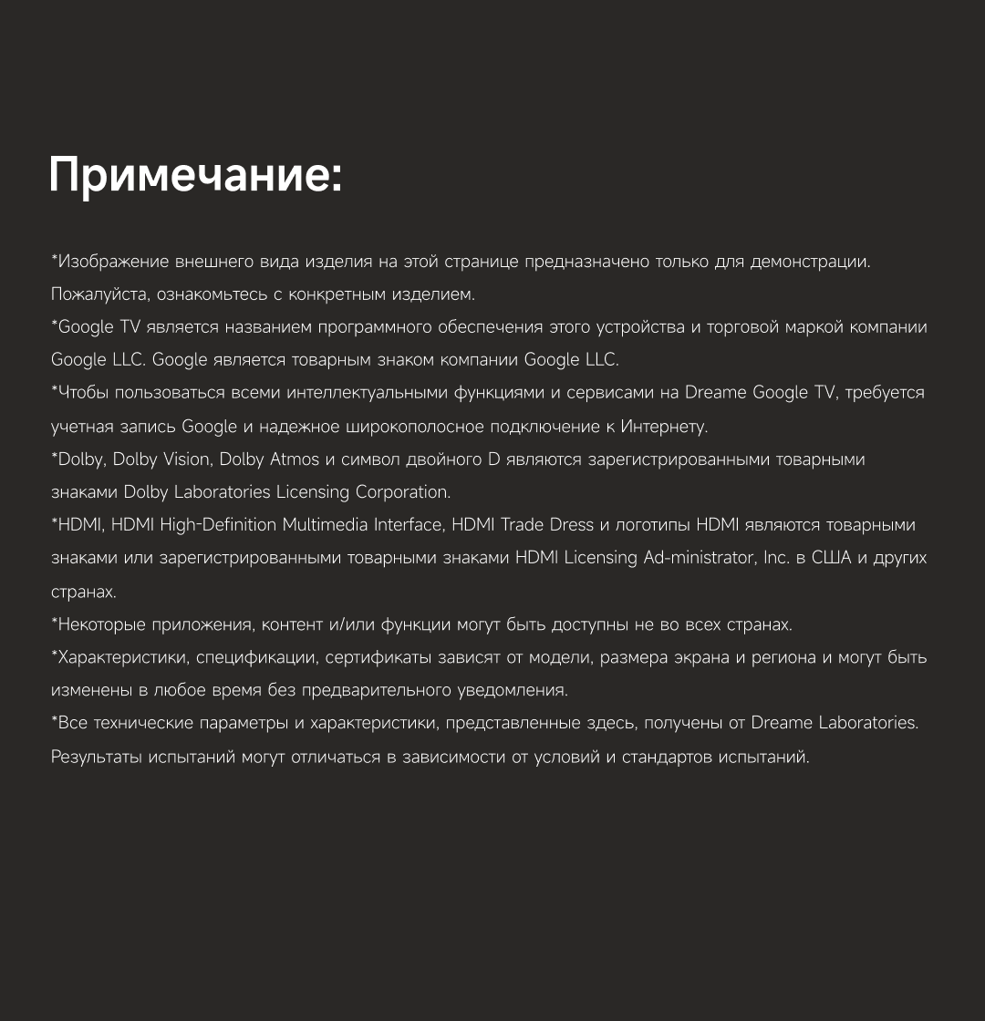 АртикулQ100УправлениеГолосовое / Кнопочное / С помощью пультаЦветчерныйОсобенностиЦветовая палитра 1.07 миллиарда цветов. 10 лет без выцветания. Технология на основе ИИ улучшает быстро движущиеся сцены, устраняя размытие и делая изображение плавным. Высокая частота обновления 120 Гц с технологией True Motion обеспечивает плавное и чёткое изображение. Режим игровой консоли Dreame включает помощника по стрельбе с прицелом, окно частоты кадров, переключение HDR в реальном времени и настраиваемые звуковые эффекты. Опция "Найти пульт".Поддержка Wi-FiЕстьКомплектацияТелевизор, пульт ДУ, батарейки типа ААА - 2 шт., кабель питания, винт для крепления ножек - 4 шт., ножки подставки - 2 шт., кабель-переходник на AV, краткое руководство.МодельQ100Краткое наименованиеDreame TV Q100Тип экрана4K QLEDЧастота обновления матрицы120 ГцSmart TVДаЯркость экрана300-150 нитОперационная системаGoogle TVРазрешение экрана3840×2160Соотношение сторон16:9HDRHDR10+/HLGДинамики2Мощность звука20 ВтWi-Fi802.11acBluetooth5.1HDMI3USB2Потребление110 ВтКрепление VESA200х200ПроцессорCortex A55ГрафикаMali G52Память16 ГБОЗУ2 ГБУгол обзора178°Время отклика9.5 мсРавномерность яркости55%Dolby VisionДаПоиск пультаДаDolby AudioДаВес7.8 кгИзготовительООО «АйПиДи Групп», Республика Беларусь, 222205, Минская область, Смолевичский р-н, Китайско-Белорусский индустриальный парк «Великий камень» Республика Беларусь, 222205, Минская область, Смолевичский р-н, Китайско-Белорусский индустриальный парк «Великий камень»ПроизводительКомпания «Хуаюнь Технолоджи (Сучжоу) Лимитед» комната 517, корпус 5011, Nº 282, улица Донгпинг, промышленный парк Сучжоу, филиал китайской пилотной зоны свободной торговли (провинция Цзянсу) в СучжоуГарантийный срок12 месяцев