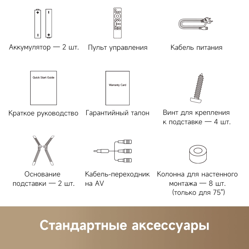 Телевизор, пульт ДУ, батарейки типа ААА - 2 шт., кабель питания, винт для крепления ножек - 4 шт., ножки подставки - 2 шт., кабель-переходник на AV, краткое руководство.