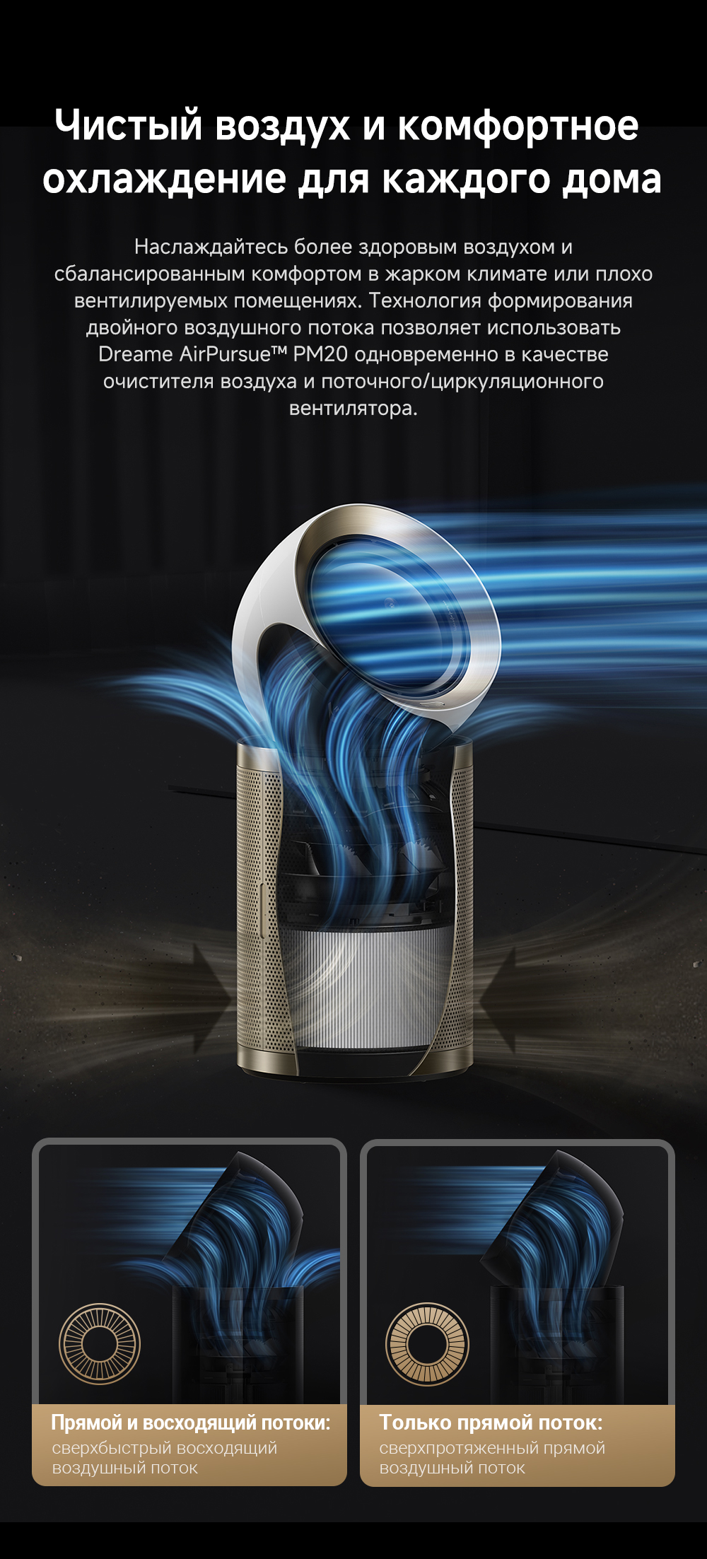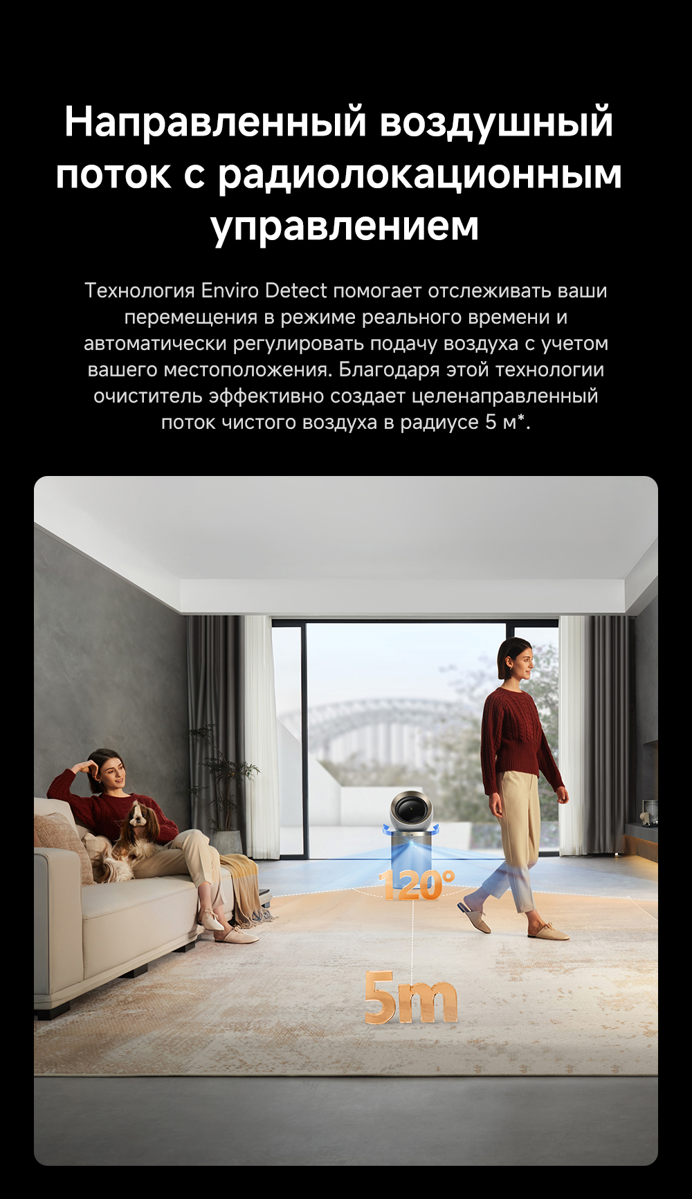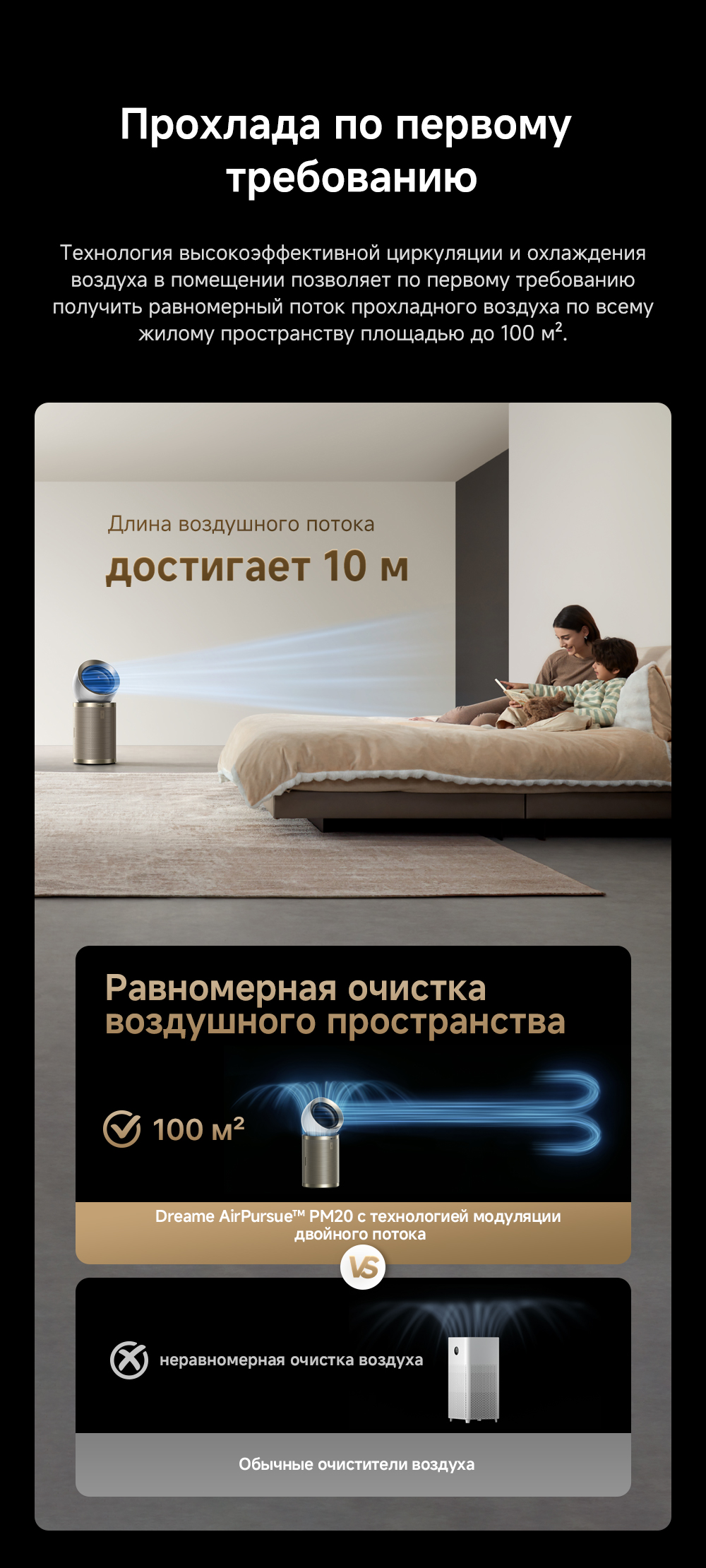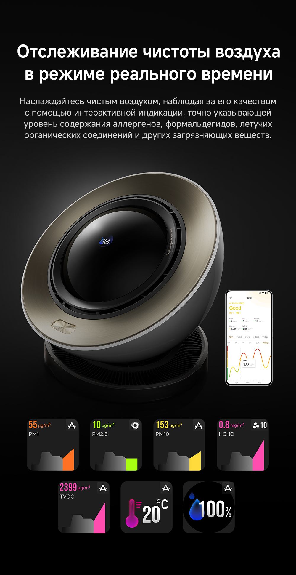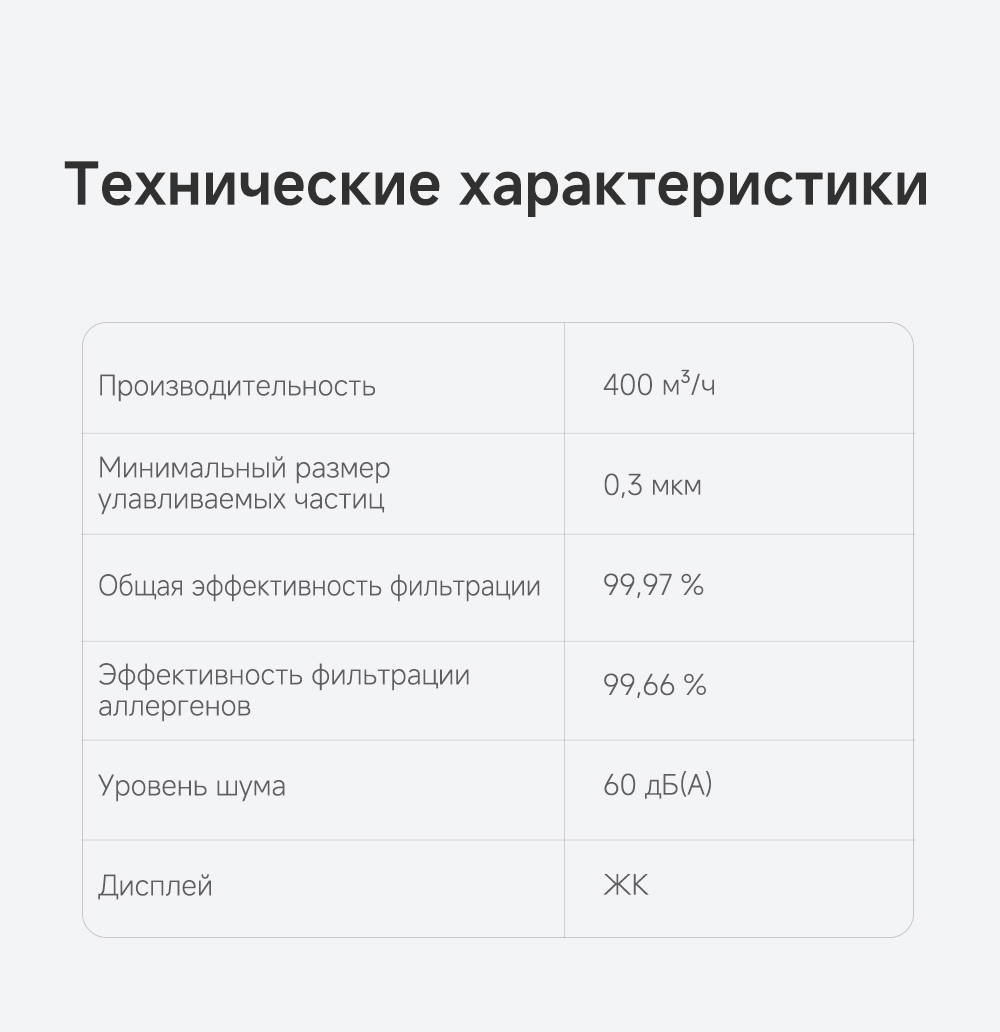 Конструкция с двумя воздушными потоками, отслеживание перемещения людей с помощью радара, надёжная многоуровневая фильтрация, функция нагрева воздуха, угловой охват 120 градусов, улавливание до 14 типов загрязнителей воздуха, уничтожение 9 видов бактерий и вирусов, пульт ДУ, удобная индикация и управление, очиститель воздуха РМ20 рассчитан на помещение до 48 м².