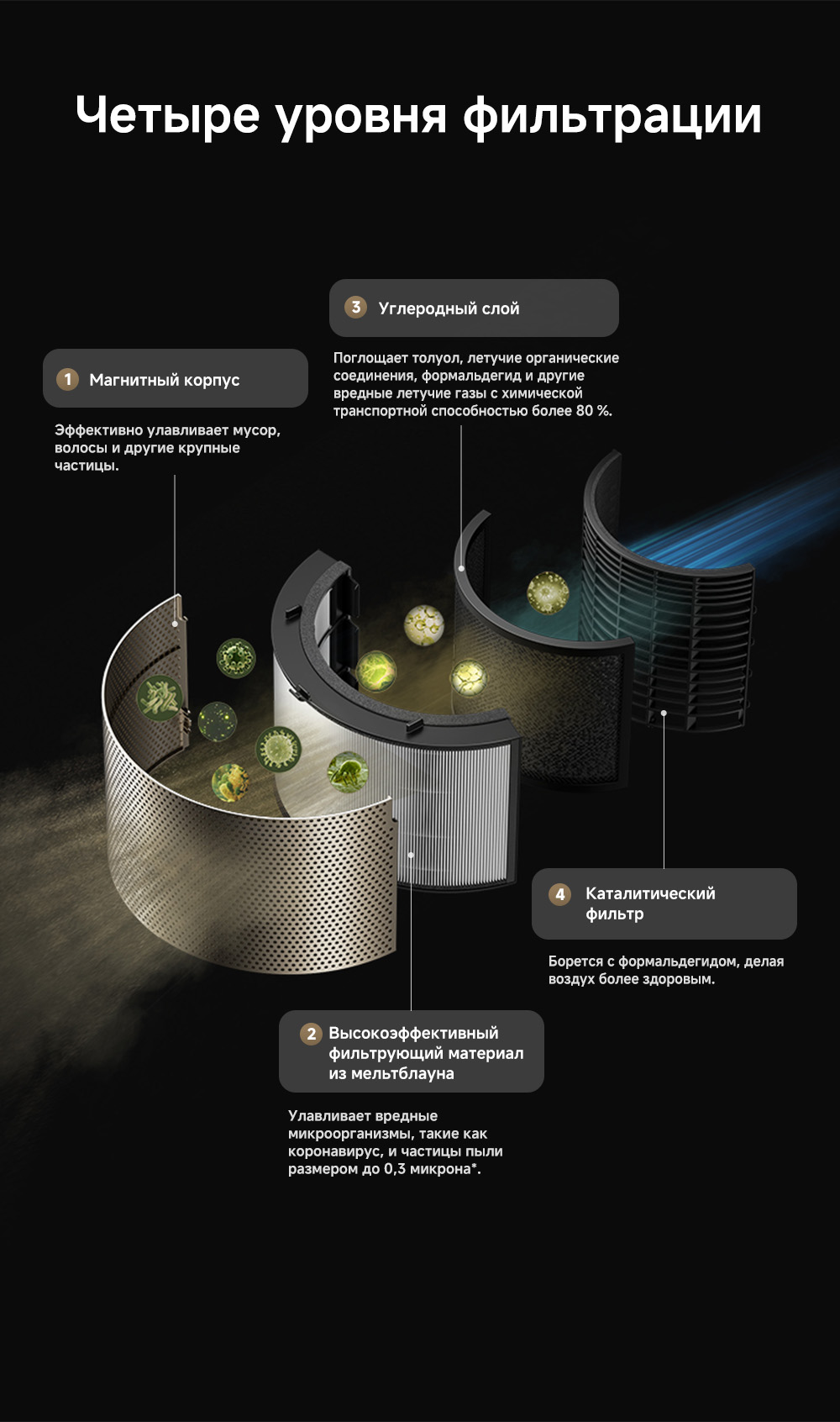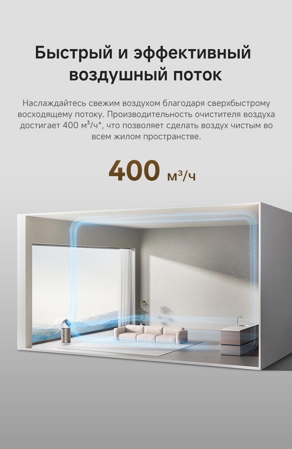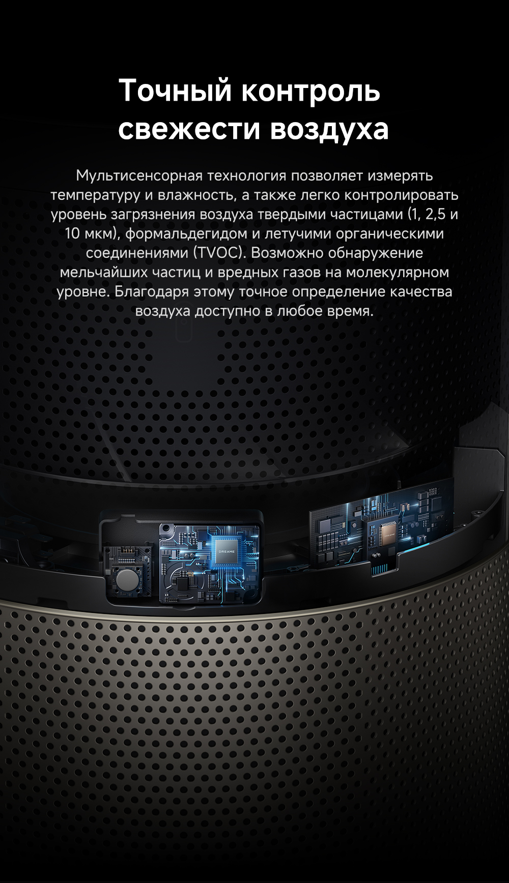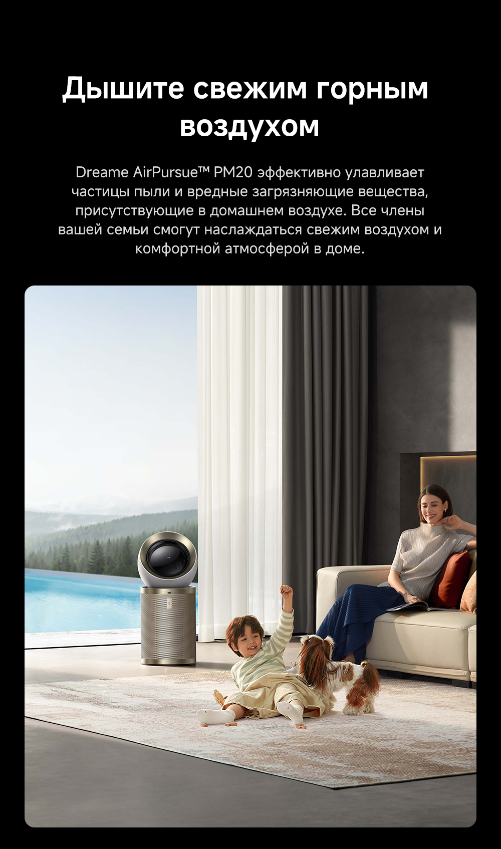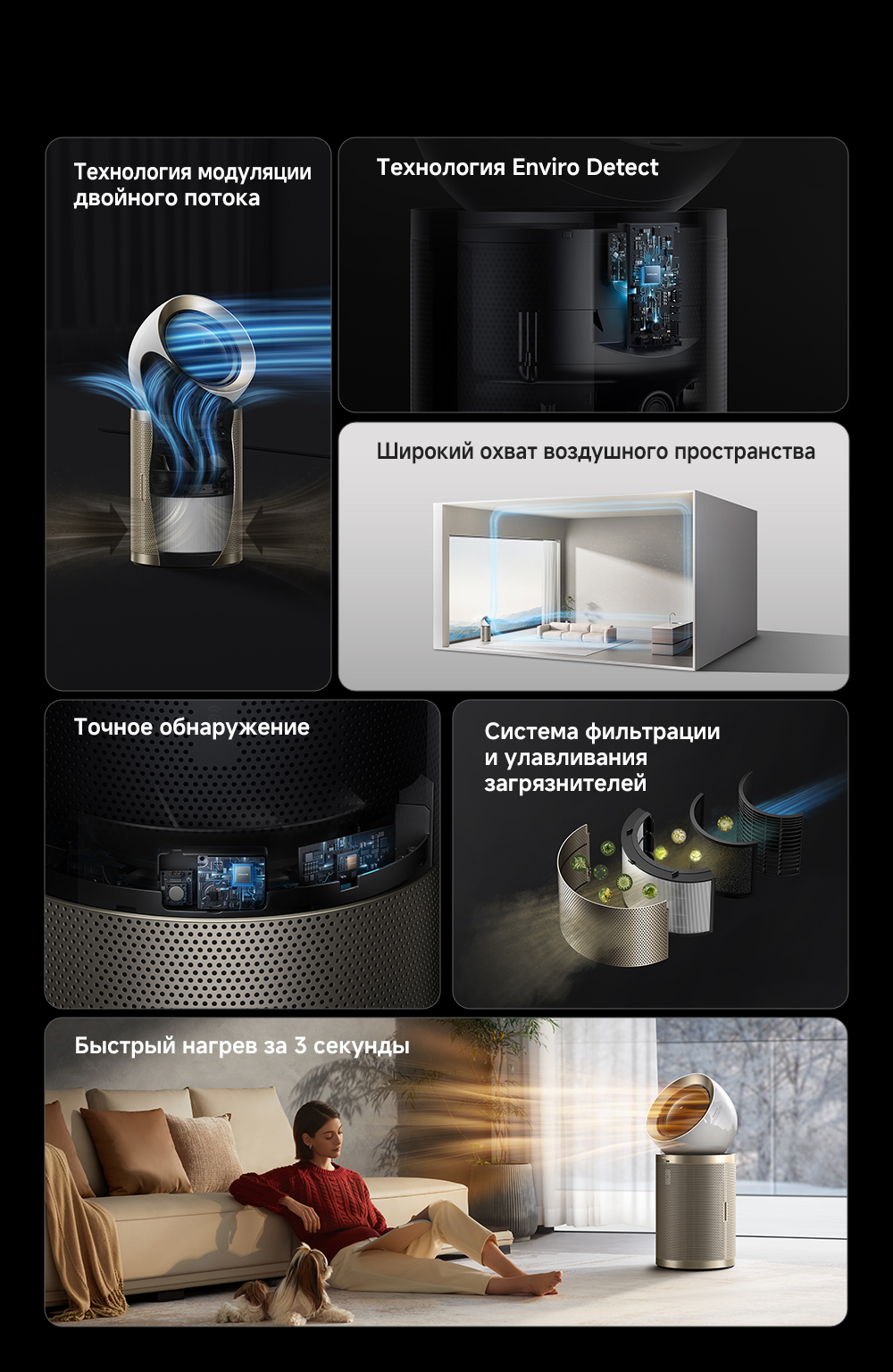 Конструкция с двумя воздушными потоками, отслеживание перемещения людей с помощью радара, надёжная многоуровневая фильтрация, функция нагрева воздуха, угловой охват 120 градусов, улавливание до 14 типов загрязнителей воздуха, уничтожение 9 видов бактерий и вирусов, пульт ДУ, удобная индикация и управление, очиститель воздуха РМ20 рассчитан на помещение до 48 м².
